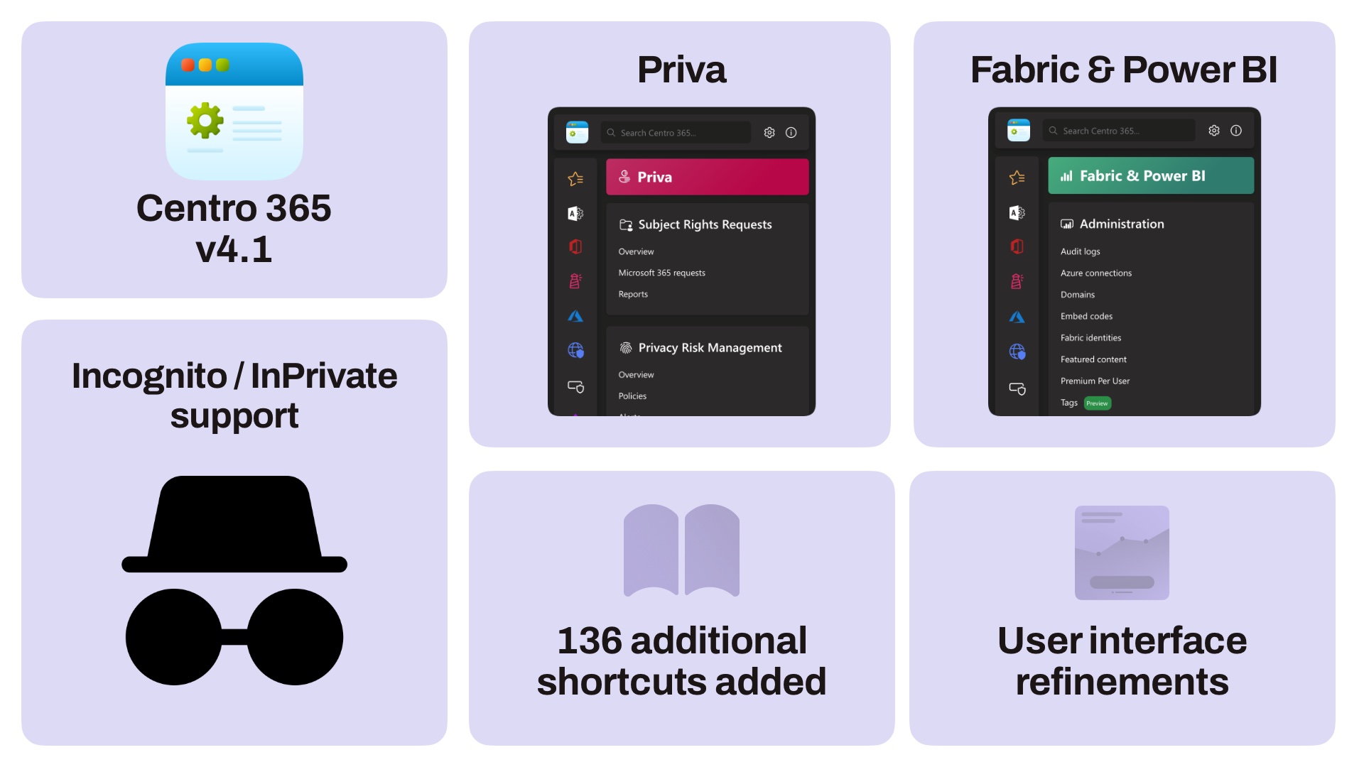 - 136 additional shortcuts added to admin centres across 365 Admin, 365 Lighthouse, Azure Portal, Defender XDR, Entra ID, Entra Global Secure Access, Exchange, Fabric, Intune, OneDrive, Power BI, Power Platform, Purview, SharePoint, Teams and Viva.